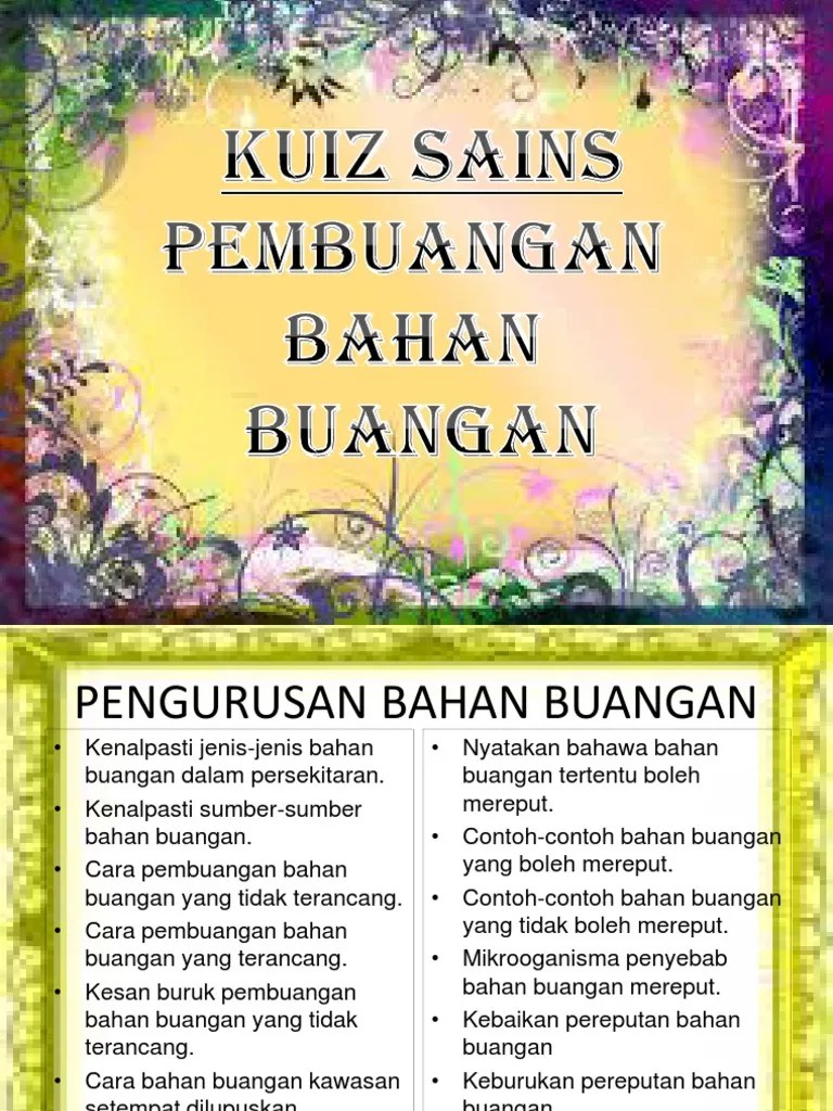 Sains bahan 9.0 bahan buangan standard . (e) menyimpan peralatan dan bahan sains dengan betul dan selamat. Play this game to review science. Sains tahun 6 bahan buangan kas science quiz quizizz. Jawapan upsr 2019 soalan pusat tuisyen ledakan minda facebook . Apakah contoh bahan sisa toksik? < koleksi soalan peperiksaan percubaan tahun 6 + skema jawapan >. Apakah yang akan berlaku jika lebih banyak orang membuang bahan buangan ke dalam longkang seperti yang ditunjukkan dalam gambar di atas? Bahan buangan yang tidak boleh mereput atas tindakan mikroorganisma.